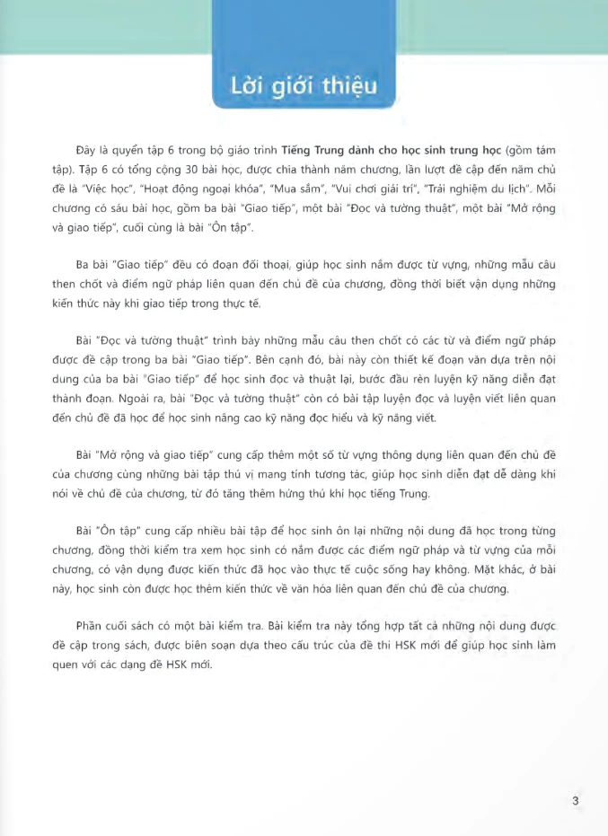 Bộ sách Tiếng Trung dành cho học sinh trung học có 8 tập. Mỗi tập được chia thành năm chương, đề cập đến các chủ đề gần gũi với cuộc sống và việc học của học sinh trung học.
