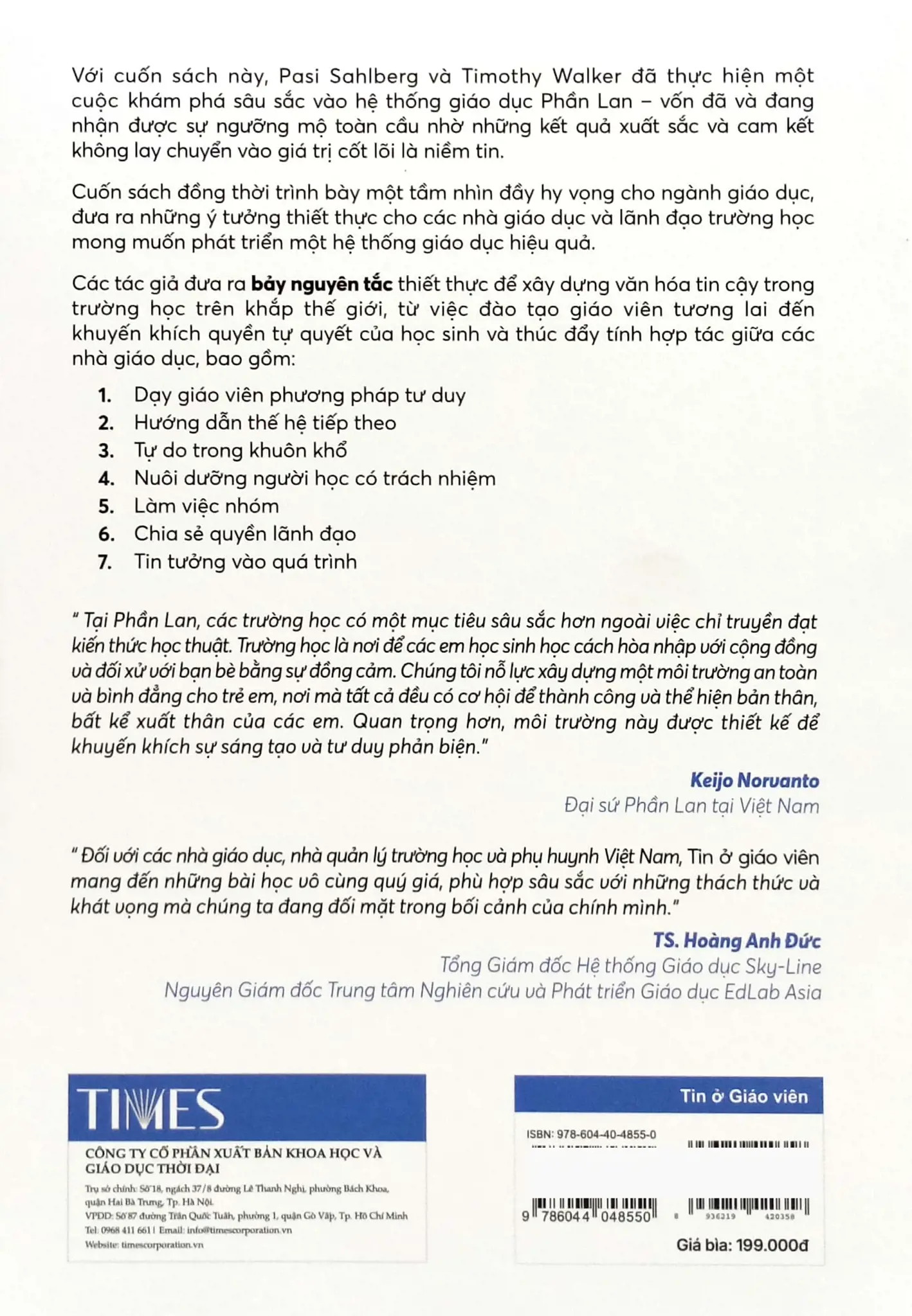 “Cuốn sách này, do Pasi Sahlberg và Tim Walker đồng tác giả, là một cuộc khám phá sâu sắc về hệ thống giáo dục Phần Lan – một hệ thống giáo dục đã nhận được sự ngưỡng mộ toàn cầu nhờ những kết quả xuất sắc và cam kết không lay chuyển vào giá trị cốt lõi là niềm tin.”