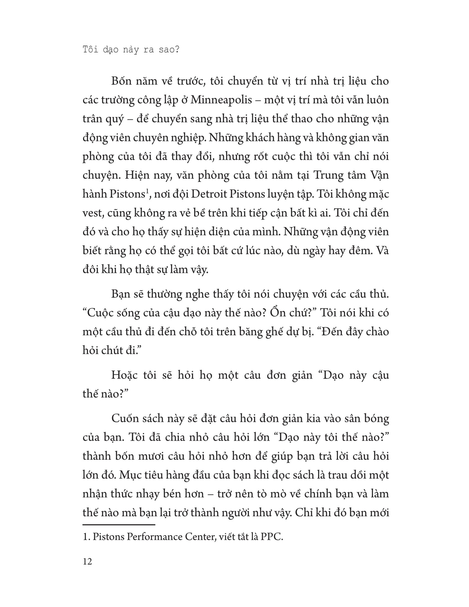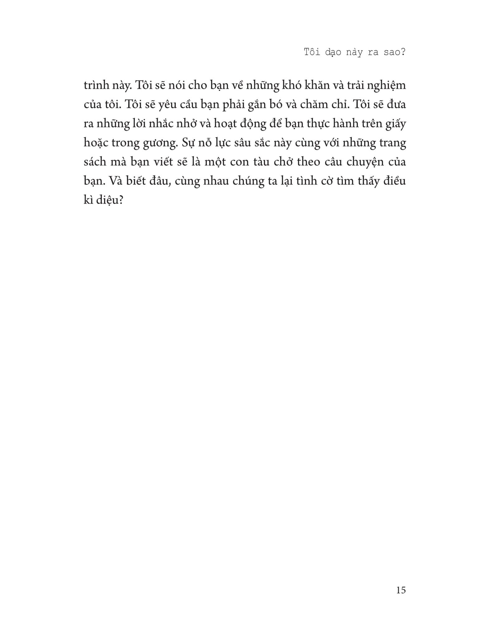 40 câu hỏi trong "Tôi dạo này ra sao?" là cơ hội đắt giá để bạn xác định con đường hướng tới sự vĩ đại của riêng mình, bất kể con đường đó ra sao, đồng thời nắm lấy quyền sở hữu con người mà bạn sẽ trở thành.