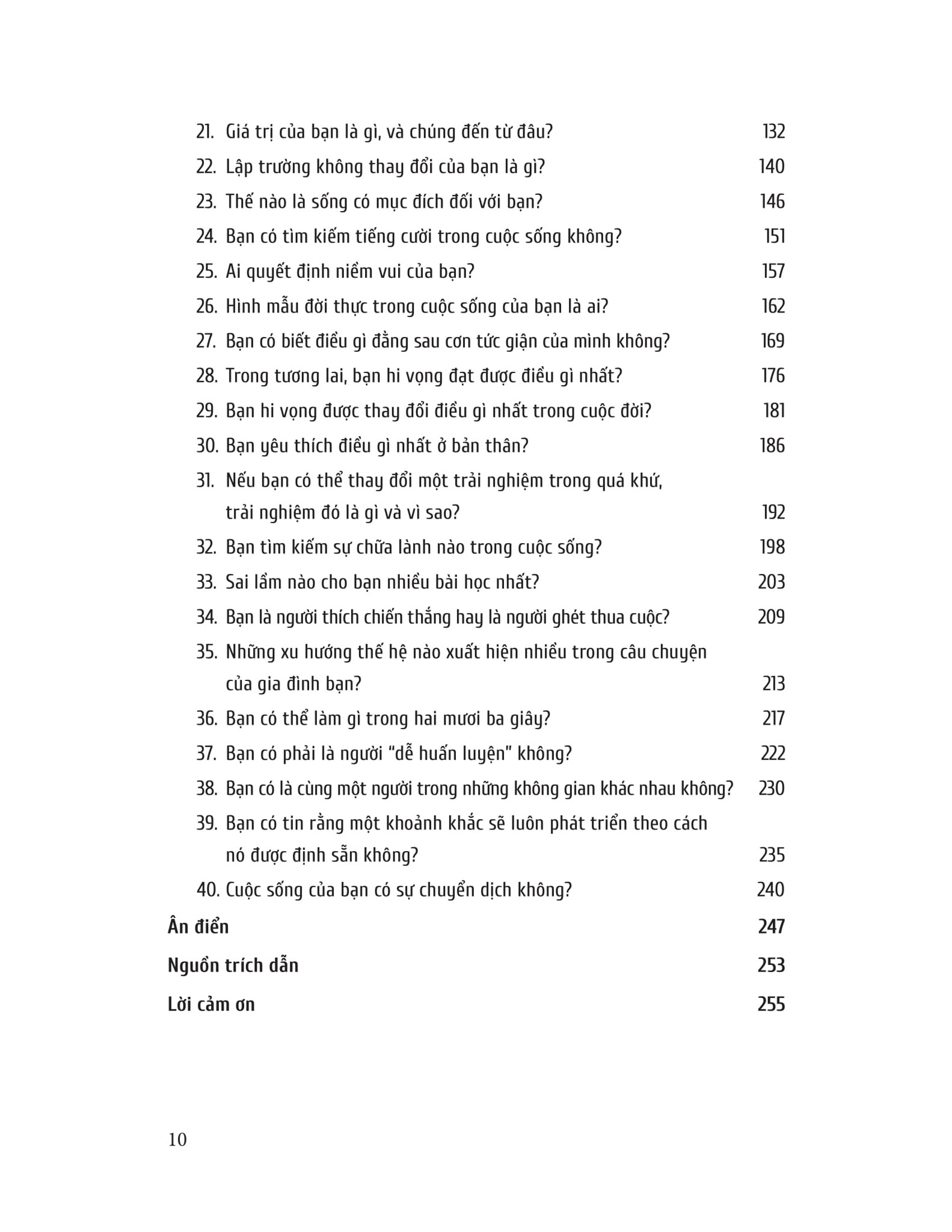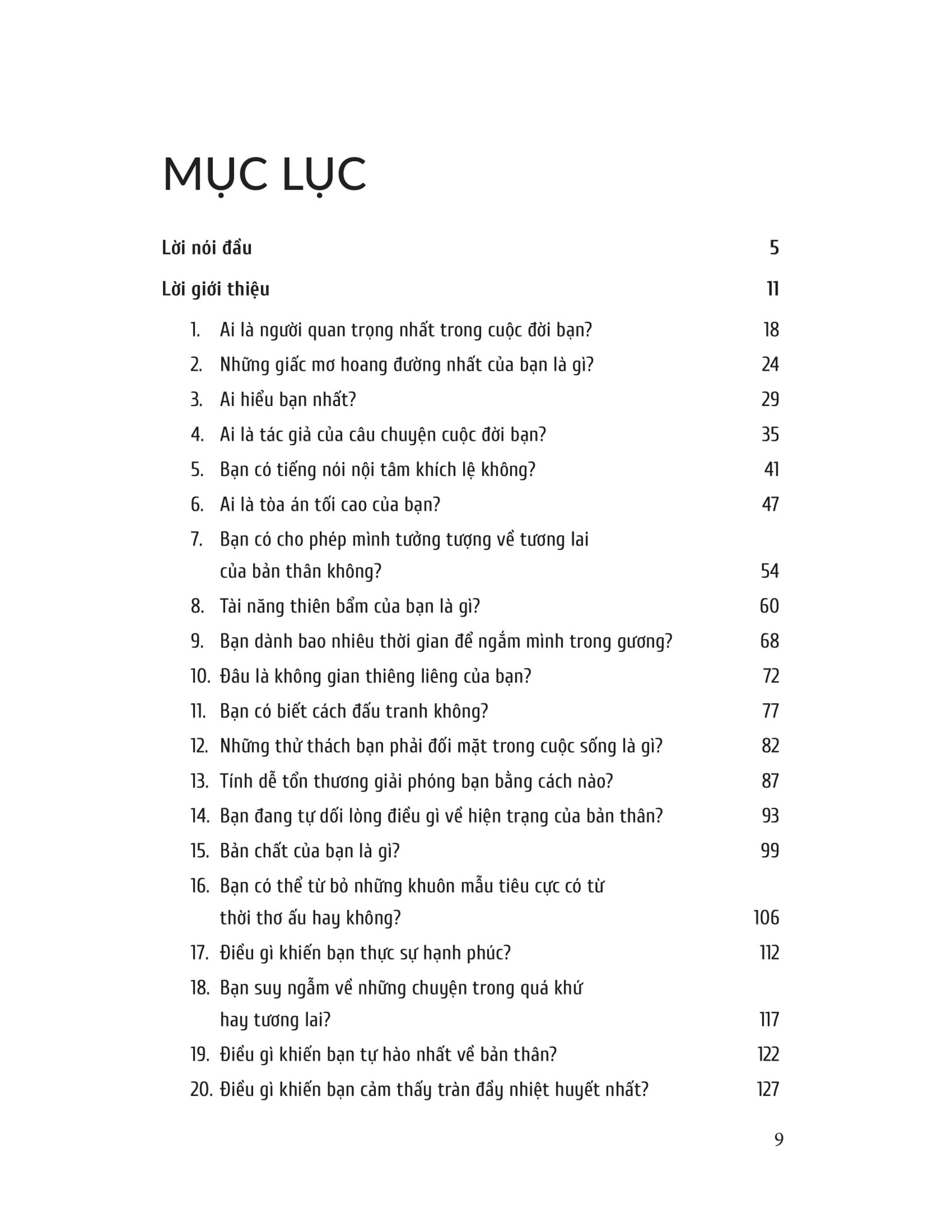 Mỗi câu hỏi trong cuốn sách sẽ đi kèm với một phần suy ngẫm ngắn gọn, sâu sắc, cùng với các gợi ý và chiến lược tự chăm sóc sẽ giúp bạn nhìn nhận lại chính mình và hòa hợp với con người mà bạn mong muốn trở thành.
