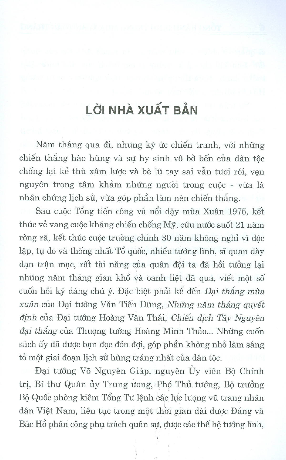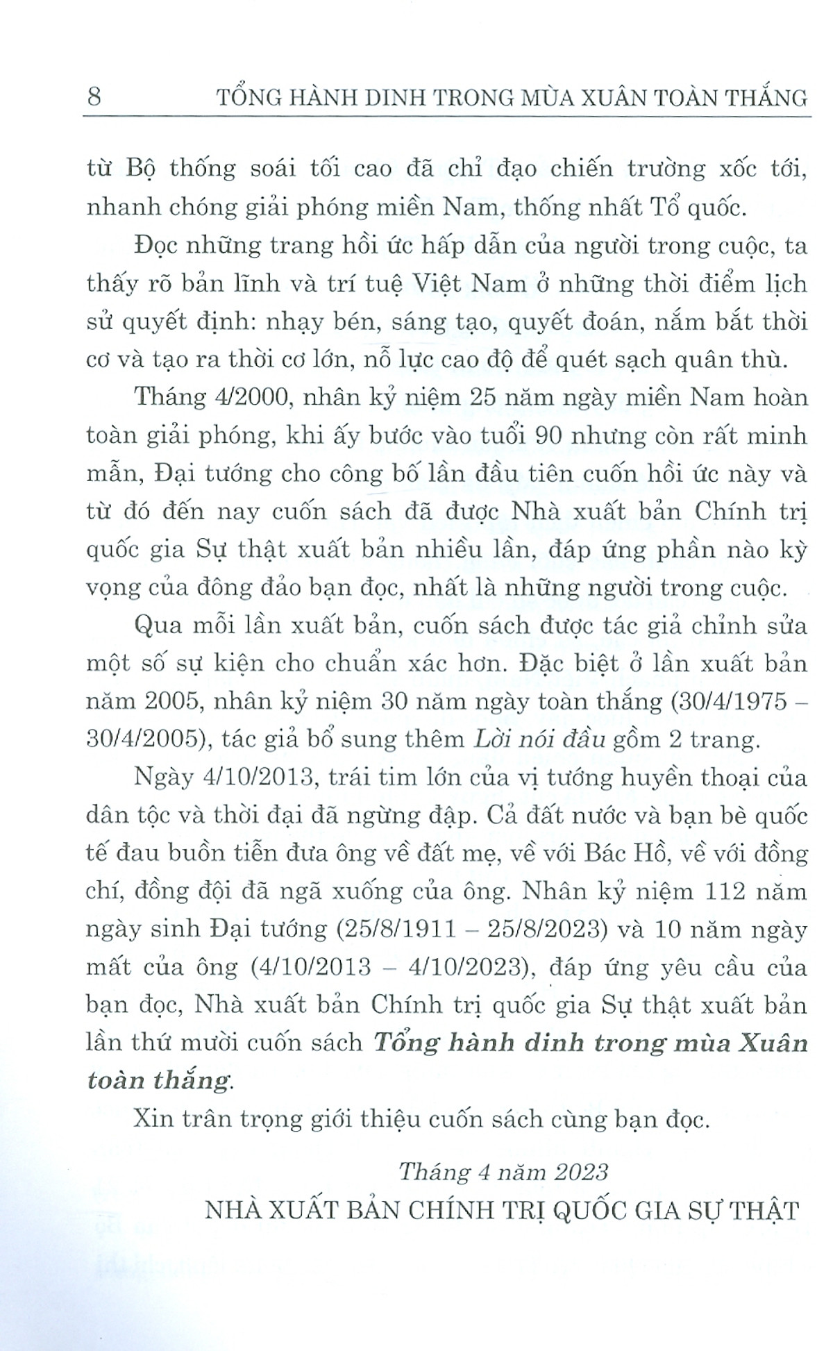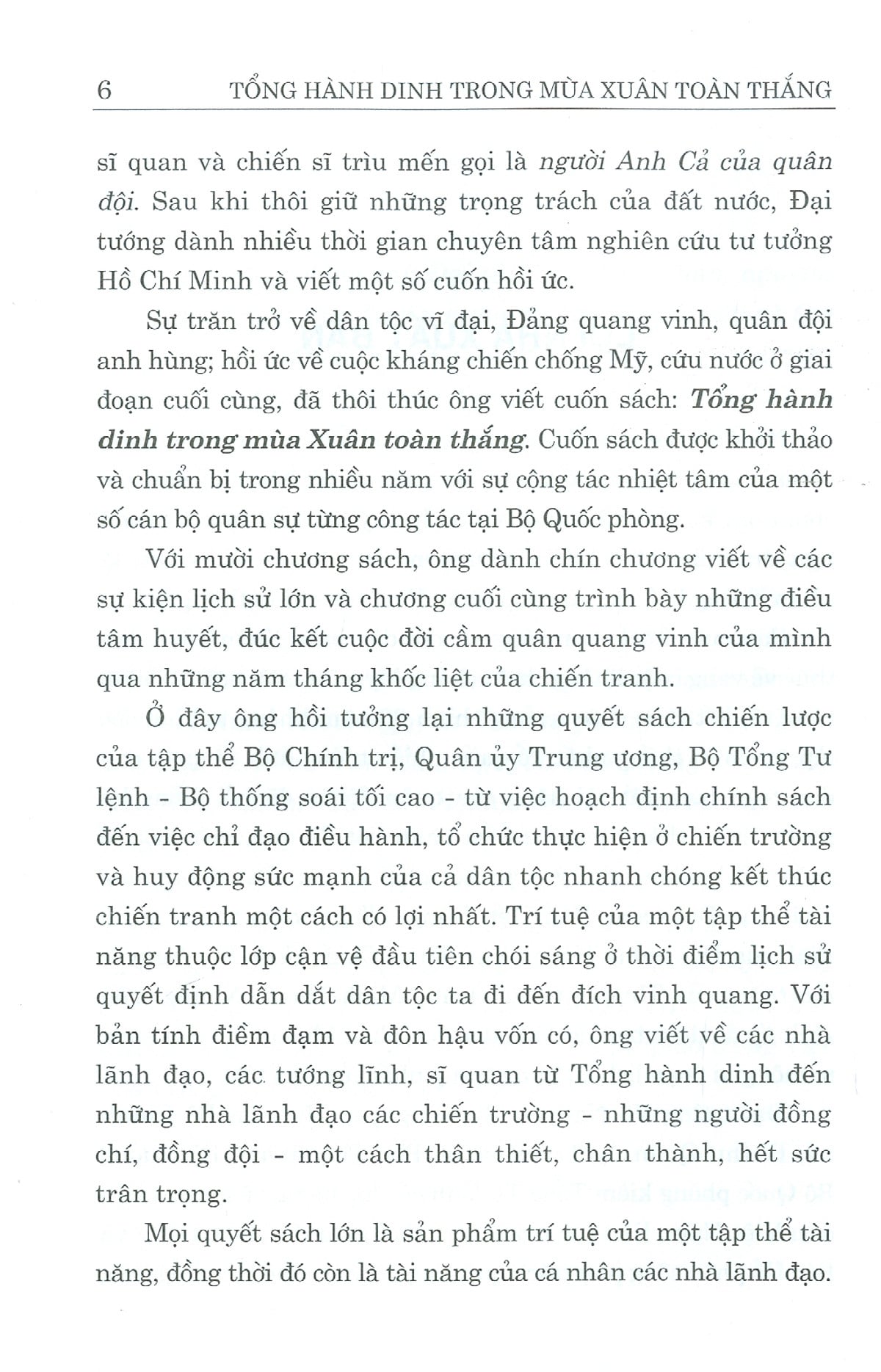 Cuốn hồi ức Tổng hành dinh trong mùa Xuân toàn thắng gồm 10 chương, trong đó Đại tướng dành chín chương viết về các sự kiện lịch sử lớn của dân tộc và chương cuối cùng trình bày những điều tâm huyết, đúc kết cuộc đời cầm quân quang vinh của mình qua những năm tháng khốc liệt của chiến tranh. Cuốn sách giúp độc giả thấy rõ bản lĩnh và trí tuệ Việt Nam ở những thời điểm lịch sử quyết định: nhạy bén, sáng tạo, quyết đoán, nắm bắt thời cơ và nỗ lực cao độ nhằm quét sạch quân thù.