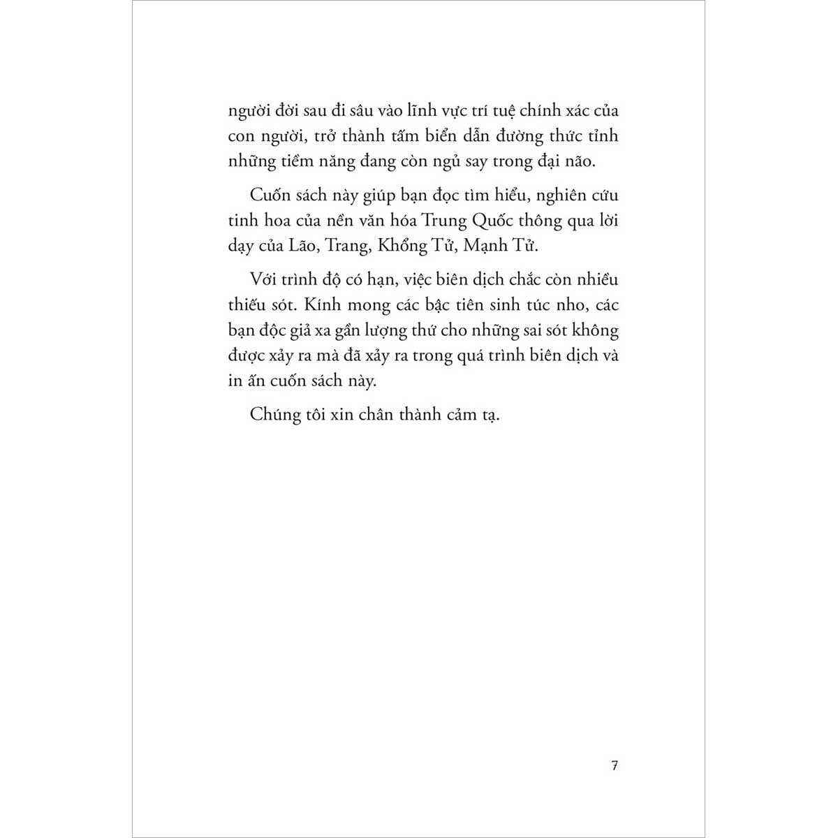 “Triết Lý Cổ Nhân” là tuyển tập tinh túy những tư tưởng nền tảng của bốn bậc thánh hiền phương Đông: Lão Tử, Trang Tử, Khổng Tử và Mạnh Tử – đại diện cho hai dòng tư tưởng chủ đạo: Đạo gia và Nho gia. Cuốn sách không chỉ là bản tập hợp những lời dạy kinh điển, mà còn là cánh cửa đưa người đọc tiếp cận với hệ thống triết học Đông phương cổ đại – sâu sắc, trừu tượng nhưng vẫn gắn bó mật thiết với đời sống cá nhân và xã hội hiện đại.