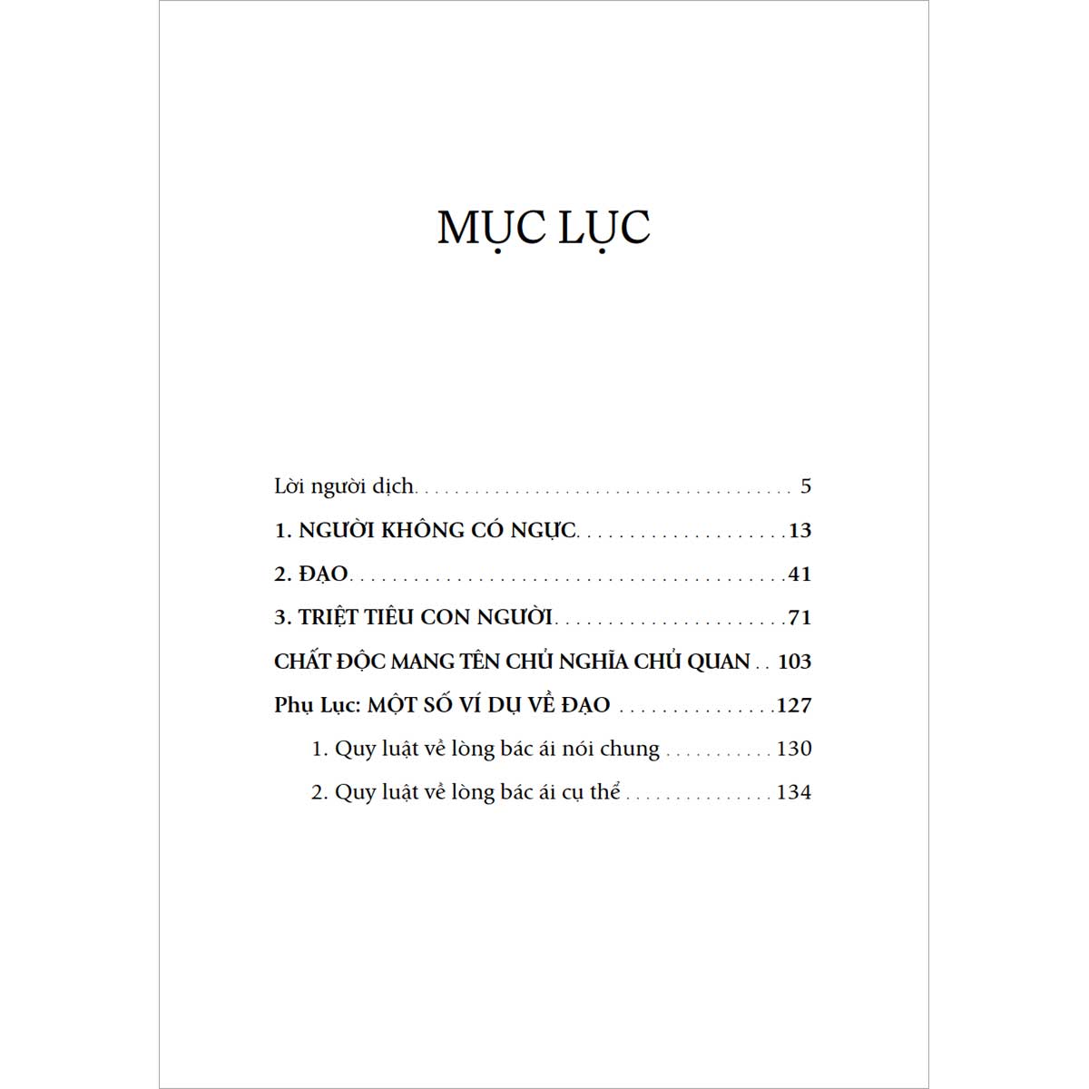 Bài đầu tiên có tựa đề “Người không có ngực”, bài thứ hai là “Đạo” và bài thứ ba là “Triệt tiêu Con Người”. Bên cạnh đó, quyển sách còn có một bài viết ngắn tóm tắt lại toàn bộ quan điểm của “Triệt tiêu Con Người” và mở rộng thông điệp để liên hệ đến đức tin Kitô giáo.