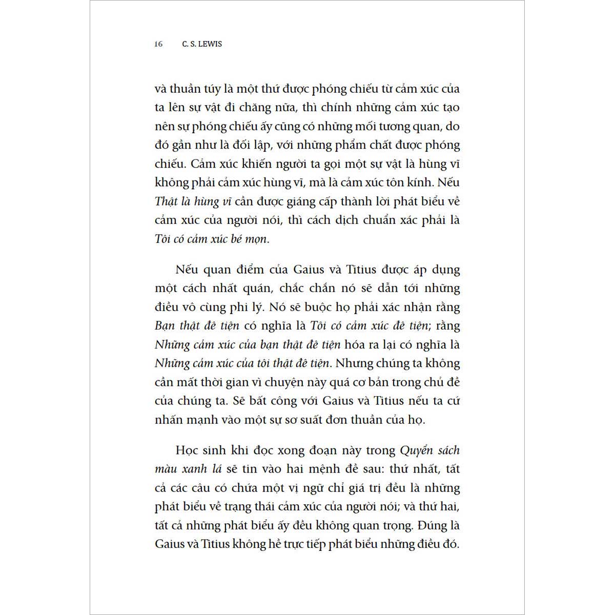 Ở phần hai, Lewis chứng minh rằng dù những người đổi mới muốn vạch trần các giá trị là cảm tính, muốn đả phá cái cũ đến đâu đi nữa, thì họ vẫn phải thừa nhận rằng có một số giá trị là hiển nhiên đúng, làm nền tảng cho tất cả những giá trị khác, những giá trị đó không cần phải chứng minh.