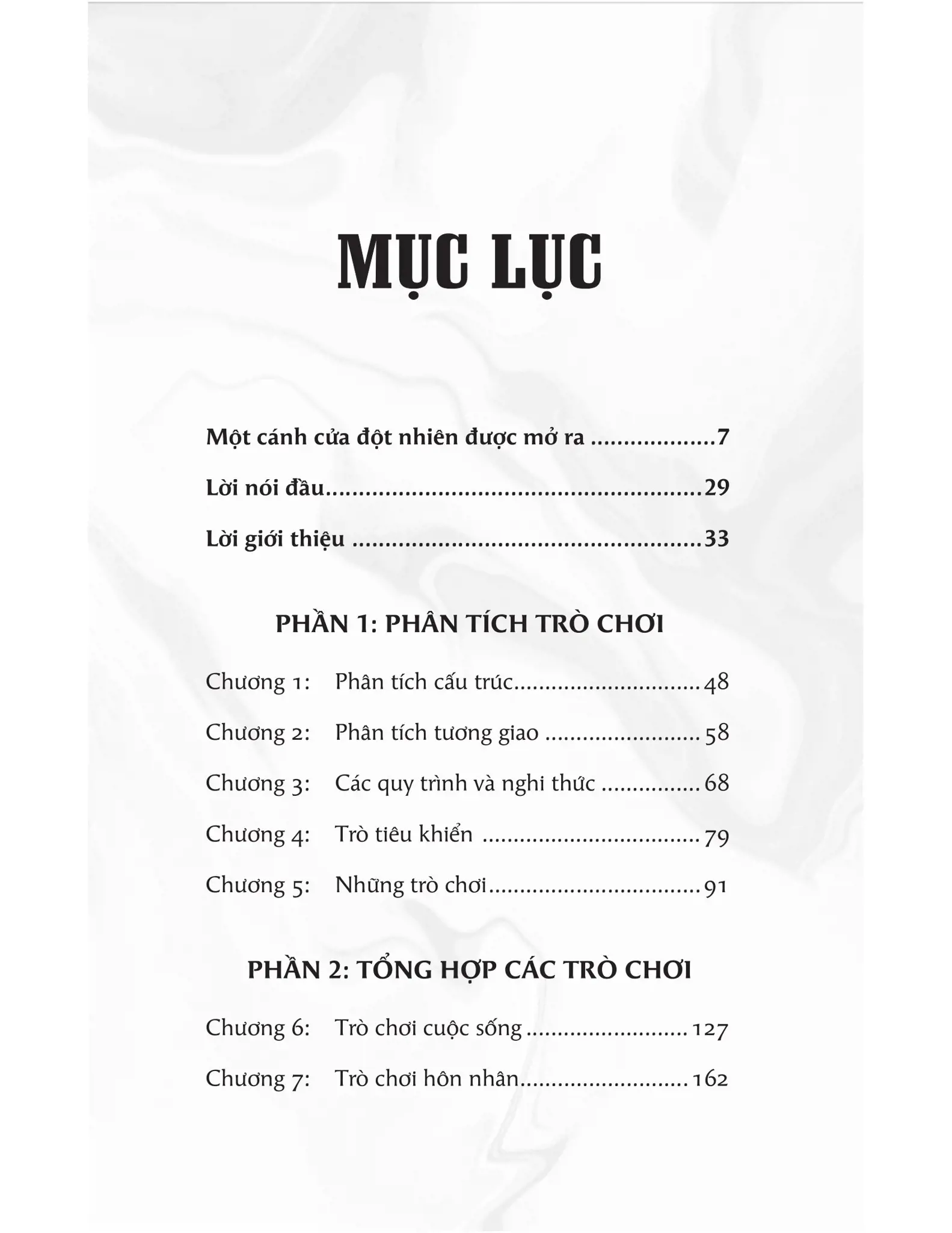 Chúng ta tham gia trò chơi mọi nơi, mọi lúc trong cuộc sống hàng ngày – trò chơi tình dục với bạn tình, trò chơi hôn nhân với bạn đời, trò chơi quyền lực với sếp và trò chơi cạnh tranh với bạn bè.
