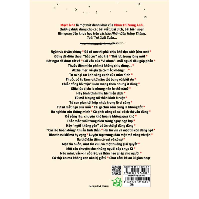 Cuộc sống luôn ở phía trước, con người vốn bận rộn, ít khi nhìn lại mình và thường đổ lỗi cho việc không có thời gian để nhìn lại mình. Đến một ngày, sao thấy mình hay khó ngủ, ruột có vấn đề, lớp mỡ ở bụng là rào cản... Giật mình nhìn lại, ngẫm ra chính ta chứ không ai khác đã đối xử bất công, hay nặng nề hơn là ngược đãi bản thân ta nhiều nhất. Ba mươi chủ đề đặt ra trong cuốn sách Từ sự mất ngủ của ruồi chỉ xoay quanh chuyện con người, gần gũi, thiết thực và không khó thực hiện để có một cuộc sống thú vị, tích cực; thế nhưng không phải muốn là được mà phải tập thành nếp, thói quen.