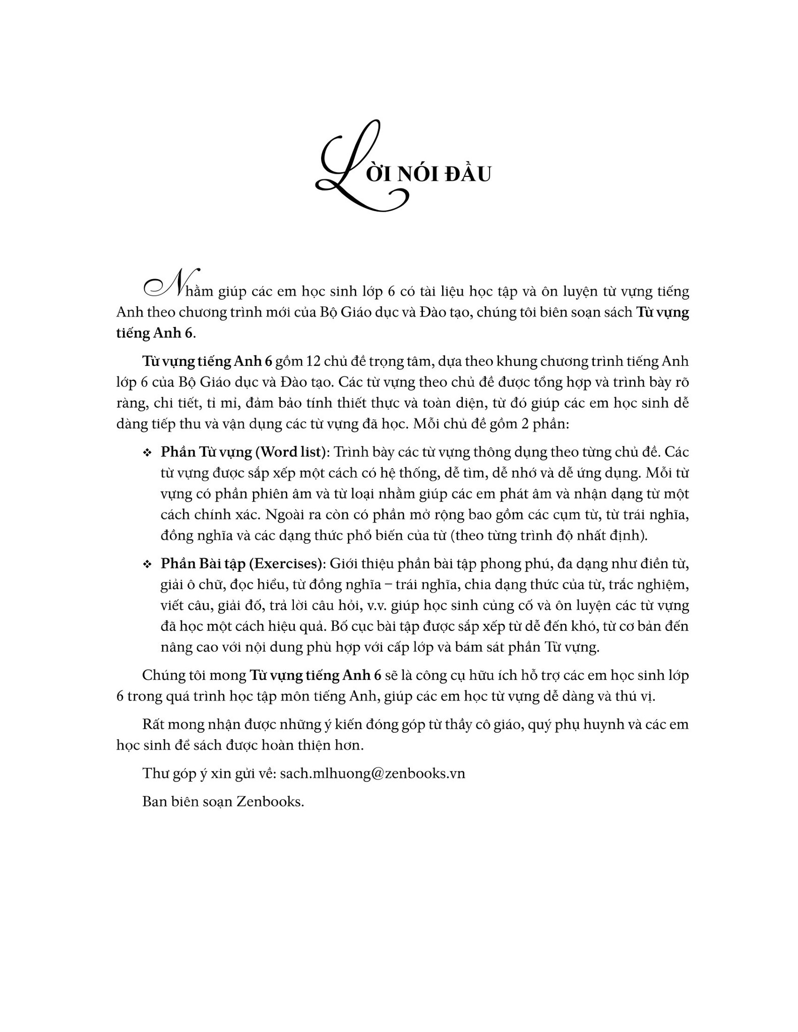 Nhằm giúp các em học sinh lớp 6 có tài liệu học tập và ôn luyện từ vựng tiếng Anh theo chương trình mới của Bô Giáo dục và Đào tạo, chúng tôi biên soạn sách Từ vựng tiếng Anh 6.