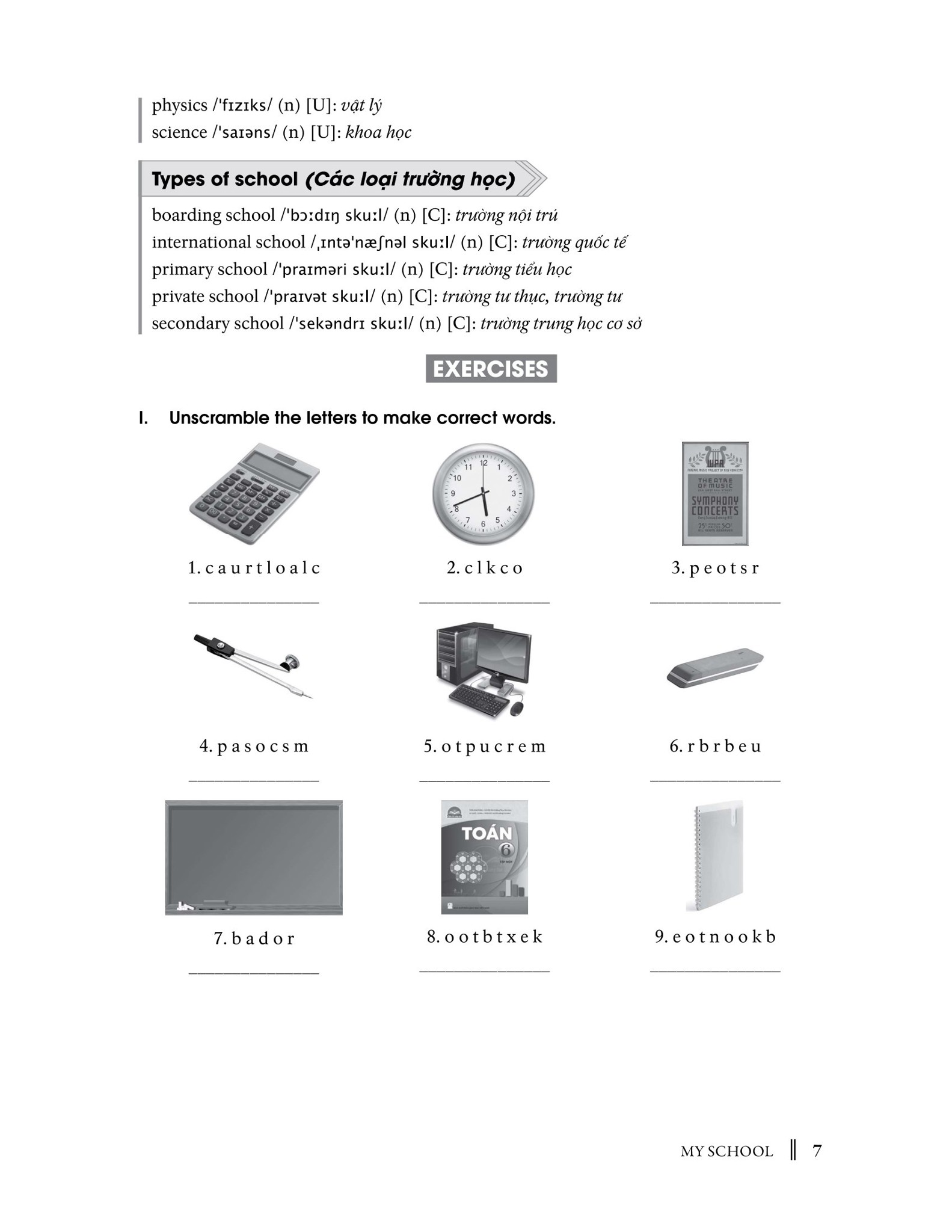 - Phần Bài tập (Exercises): Giới thiệu phần bài tập phong phú, đa dạng như điền từ, giải ô chữ, đọc hiểu, từ đồng nghĩa- trái nghĩa, chia dạng thức của từ, trắc nghiệm, viết câu, giải đố, trả lời câu hỏi, v.v. giúp học sinh củng cố và ôn luyện các từng vựng đã học một cách hiệu quả. Bố cục bài tập được sắp xếp từ dễ đến khó, từ cơ bản đến nâng cao với nội dung phù hợp với cấp lớp và bán sát phần Tự Vựng.