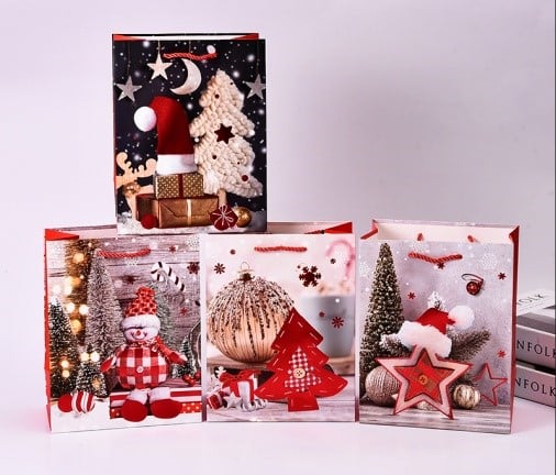 Thiết Kế Lấp Lánh: Túi Quà Noel được thiết kế với lớp phủ lấp lánh tạo nên vẻ sáng bóng và lấp lánh. Những chiếc túi này sẽ làm cho món quà trở nên đặc biệt và thú vị.