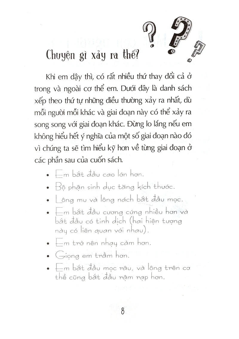 Các bạn nam trước ngưỡng cửa dậy thì đều có chung nỗi băn khoăn lo lắng trước sự thay đổi của chính mình, nào là cơ bắp phát triển, “rừng rậm” xuất hiện, giọng nói “khàn khàn vịt đực”, tâm lý thất thường, rồi chuyện học hành thi cử cùng bao vấn đề khác ở trường… Đừng vội lo lắng, hãy để cuốn cẩm nang “Tuổi dậy thì - Từ “Cậu bé” đến “Anh chàng”” đồng hành cùng các em trên hành trình dậy thì, cùng lắng nghe những lời tư vấn, chia sẻ để hiểu hơn về giai đoạn vừa lý thú lại vừa khó nhằn này nhé!