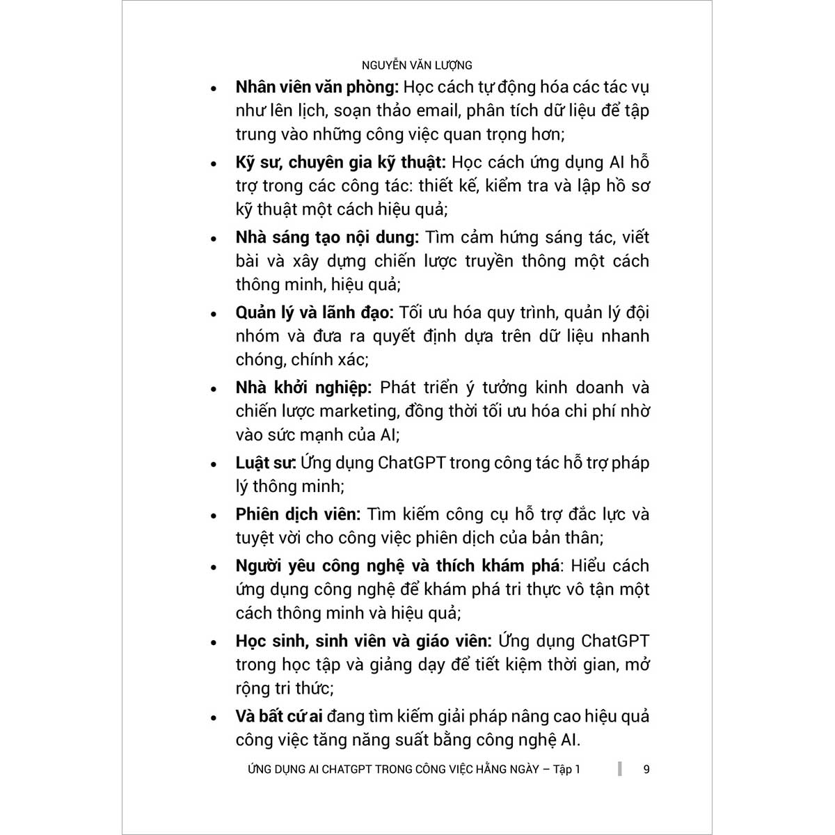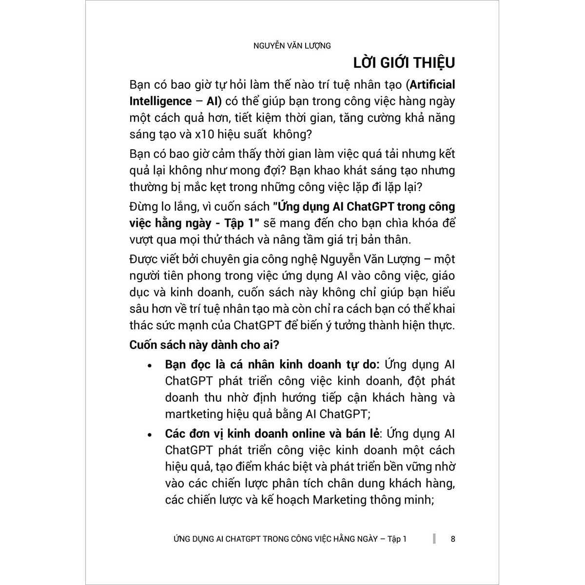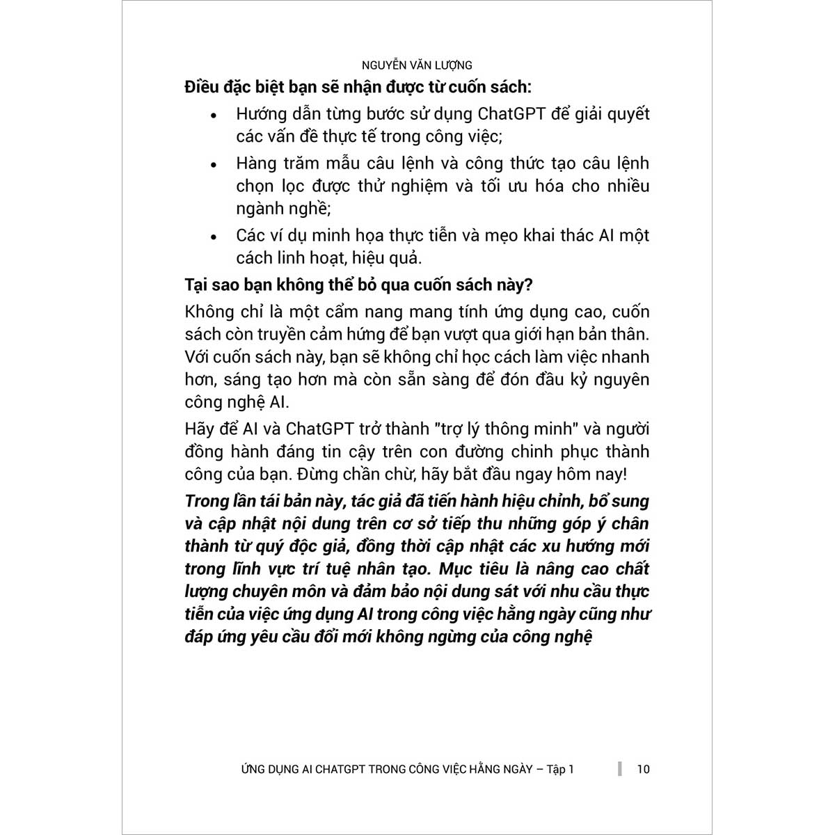 "Ứng Dụng ChatGPT - AI Trong Công Việc Hàng Ngày" là cuốn sách mở ra cánh cửa đến thế giới của trí tuệ nhân tạo, giúp bạn khám phá cách tận dụng ChatGPT và các công cụ AI khác để nâng cao hiệu suất làm việc, tối ưu quy trình và sáng tạo hơn trong công việc lẫn cuộc sống. Từ viết email, soạn thảo văn bản, lên kế hoạch công việc đến phân tích dữ liệu và hỗ trợ ra quyết định, cuốn sách cung cấp những hướng dẫn thực tiễn, mẹo sử dụng thông minh cùng các tình huống ứng dụng thực tế giúp bạn nhanh chóng làm chủ AI. Không chỉ dừng lại ở công cụ, tác giả còn giúp bạn hiểu rõ hơn về cách tư duy và làm việc cùng AI để không chỉ thích nghi mà còn bứt phá trong thời đại công nghệ. Với lối viết sinh động, dễ tiếp cận và giàu tính ứng dụng, đây là cuốn sách không thể thiếu dành cho bất kỳ ai muốn khai thác sức mạnh của AI để làm việc thông minh hơn, hiệu quả hơn mỗi ngày.