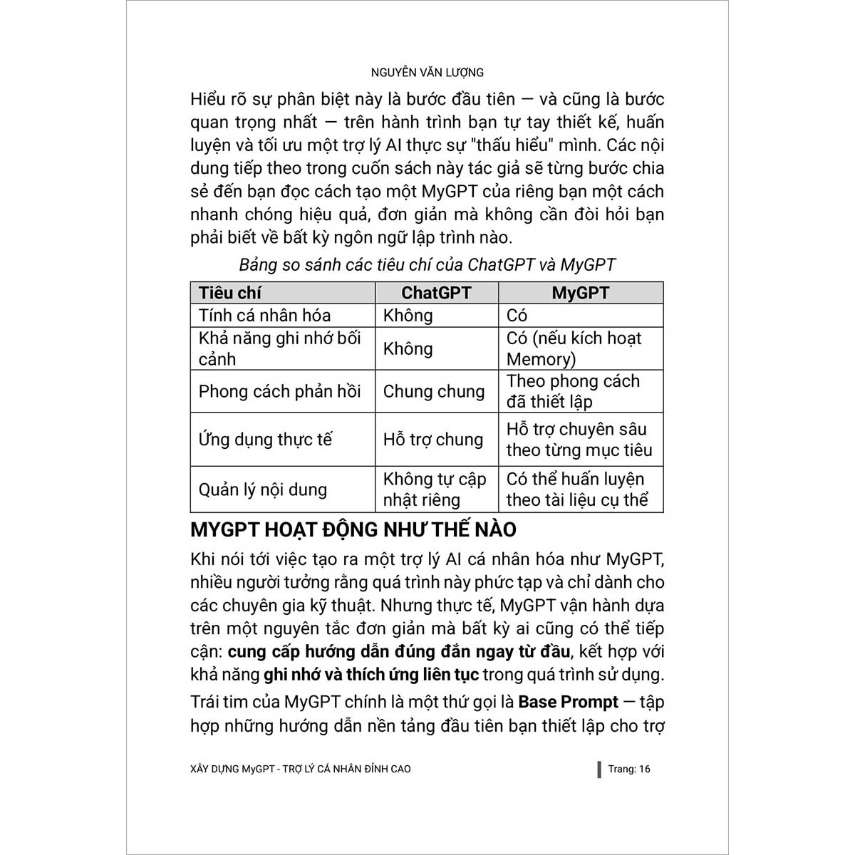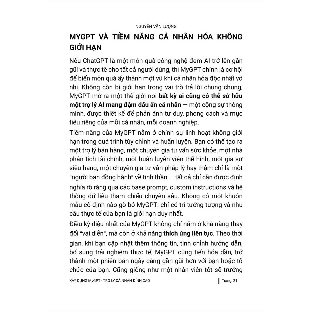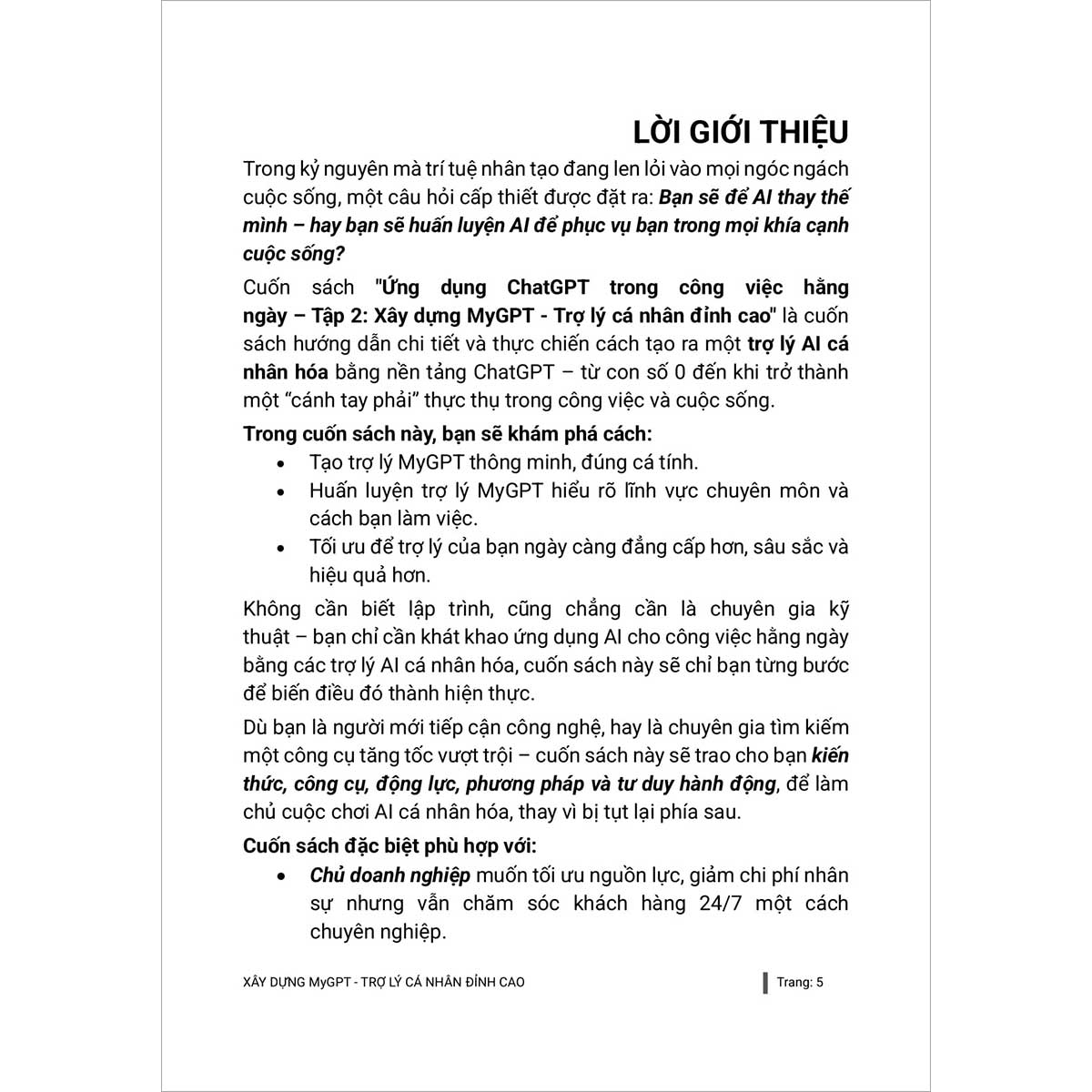 Cuốn sách "Ứng dụng ChatGPT trong công việc hằng ngày – Tập 2: Xây dựng MyGPT - Trợ lý cá nhân đỉnh cao" là cuốn sách hướng dẫn chi tiết và thực chiến cách tạo ra một trợ lý Al cá nhân hóa bằng nền tảng ChatGPT – từ con số 0 đến khi trở thành một “cánh tay phải” thực thụ trong công việc và cuộc sống.