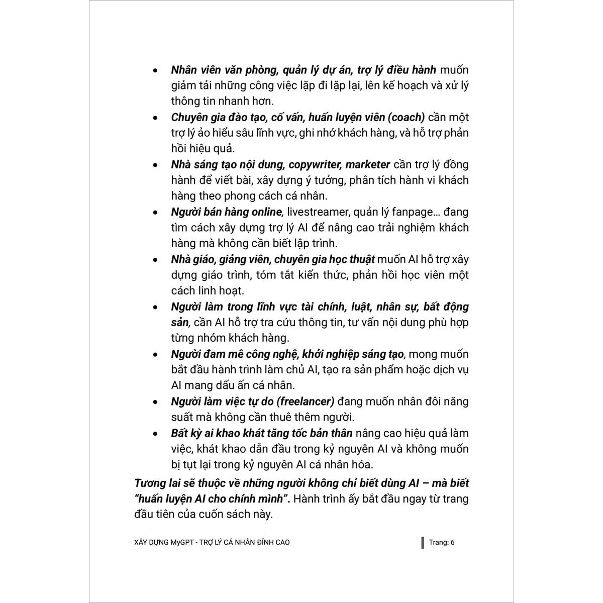 Dù bạn là người mới tiếp cận công nghệ, hay là chuyên gia tìm kiếm một công cụ tăng tốc vượt trội – cuốn sách này sẽ trao cho bạn kiến thức, công cụ, động lực, phương pháp và tư duy hành động, để làm chủ cuộc chơi AI cá nhân hóa, thay vì bị tụt lại phía sau.