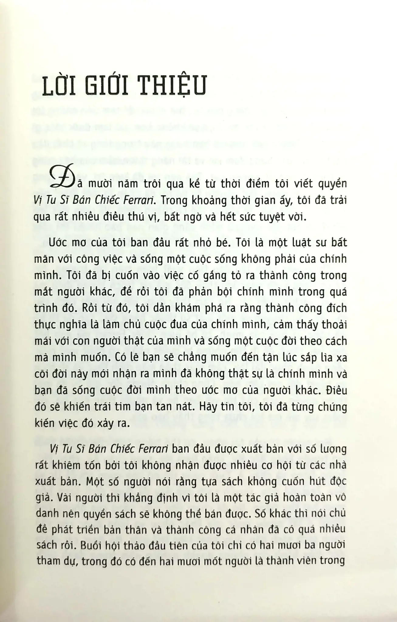 Vị Tu Sĩ Bán Chiếc Ferrari không phải là một cuốn sách xa lạ, cuốn sách này là một trong những ấn phẩm kinh điển của thế giới về đề tài truyền cảm hứng, theo đuổi lý tưởng sống, và hướng về một cuộc sống hạnh phúc. Đây cũng là cuốn sách đầu tiên mà tác giả, nhà diễn thuyết nổi tiếng thế giới Robin Sharma chấp bút.