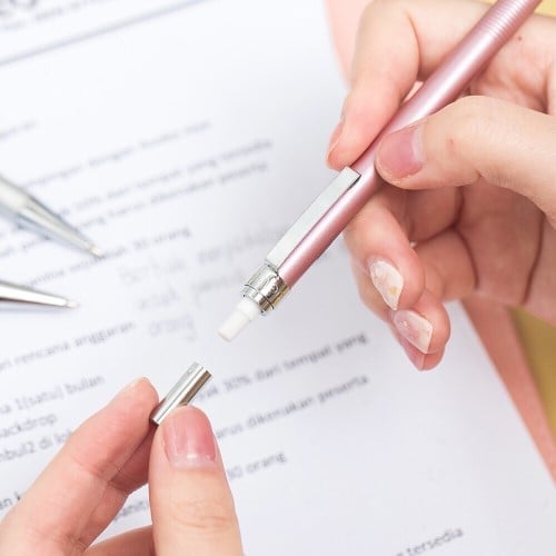 Cơ chế bấm được thiết kế ở đuôi bút rất tiện dụng. Bạn chỉ cần giữ thân bút và bấm nhẹ là có thể dễ dàng bấm thêm chì để dùng.