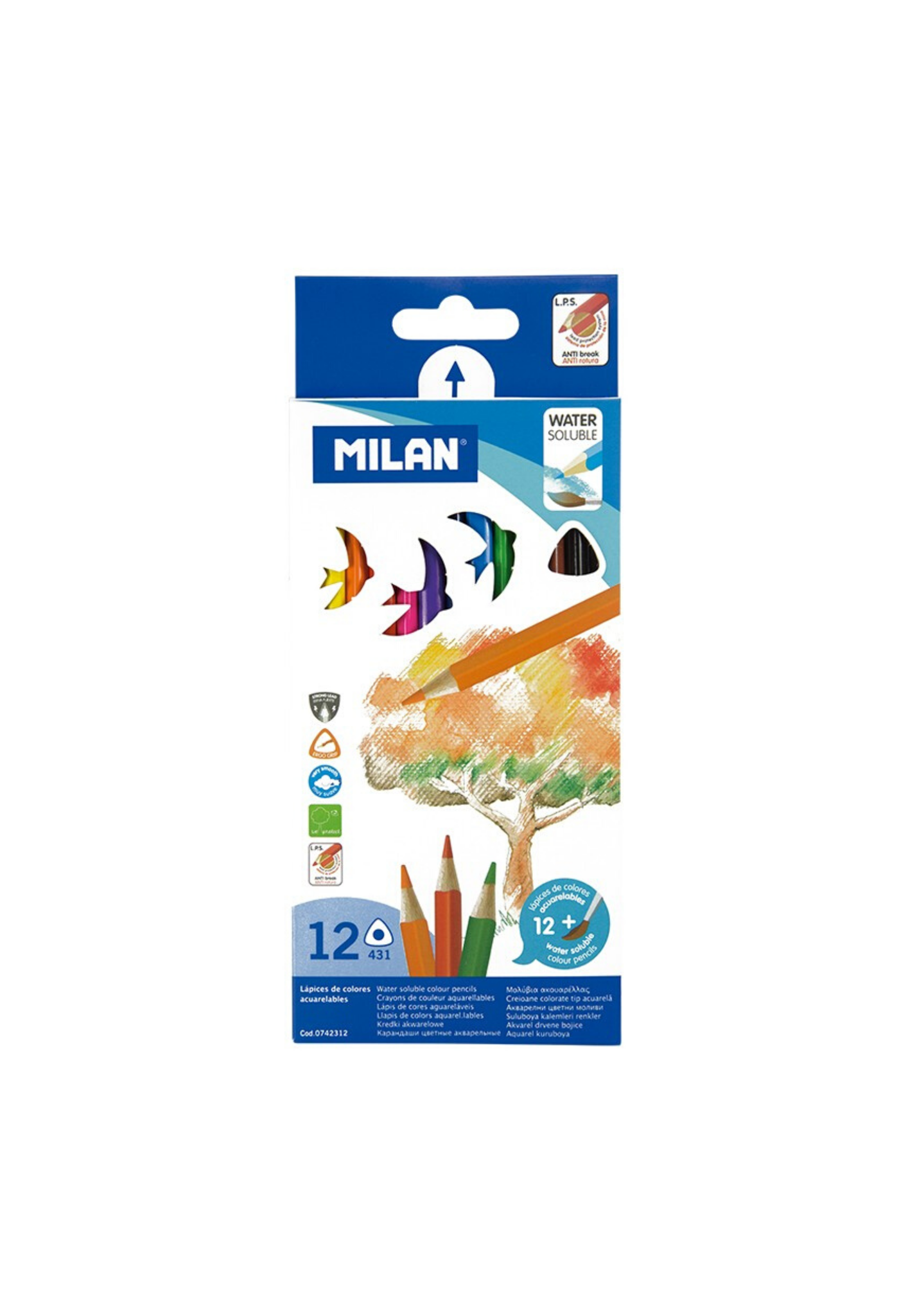 Viết chì màu Milan 12 cây 0742312 12 cây bút chì màu nước với ngòi chì 2,9 mm. Việc sử dụng bút chì màu nước kết hợp tính linh hoạt của màu nước với độ chính xác của bút chì màu. Chúng có thể được sử dụng khô hoặc ướt hoặc kết hợp cả hai kỹ thuật. Đầu chì tạo ra một nét đồng đều và được thiết kế với hệ thống chống phá độc đáo. Hệ thống bảo vệ chì (LPS), trong đó chì được gia cố bằng cách kết dính vào gỗ. Mỗi màu có tên riêng. Bao gồm một loạt bút vẽ trường 101.
