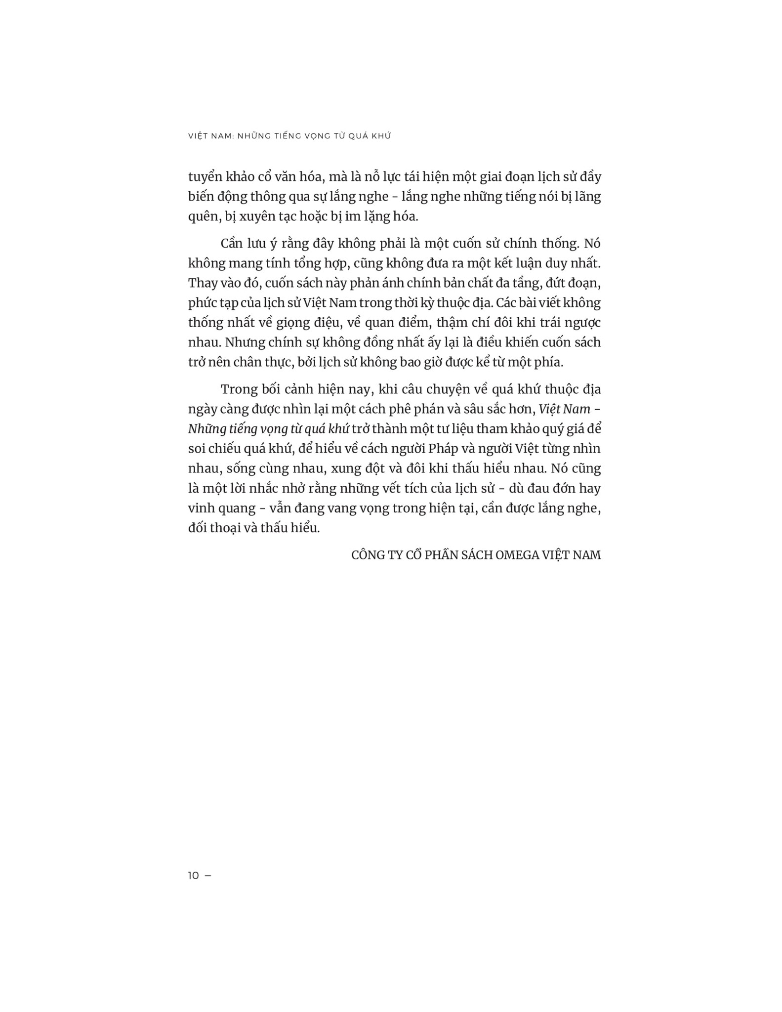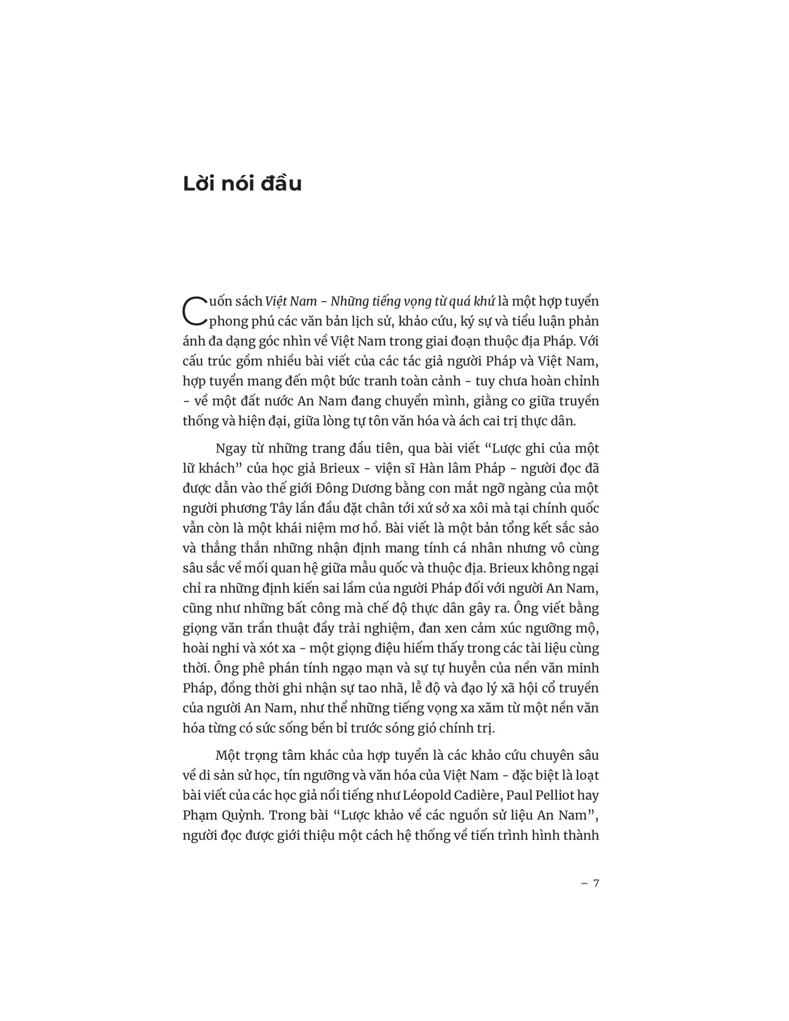 “Việt Nam: Những Tiếng Vọng Từ Quá Khứ” là một hợp tuyển phong phú gồm các văn bản lịch sử, khảo cứu, ký sự và tiểu luận về Việt Nam trong giai đoạn thuộc địa Pháp – khi đất nước đang chuyển mình giữa truyền thống và hiện đại, giữa lòng tự tôn văn hóa dân tộc và ách cai trị thực dân.