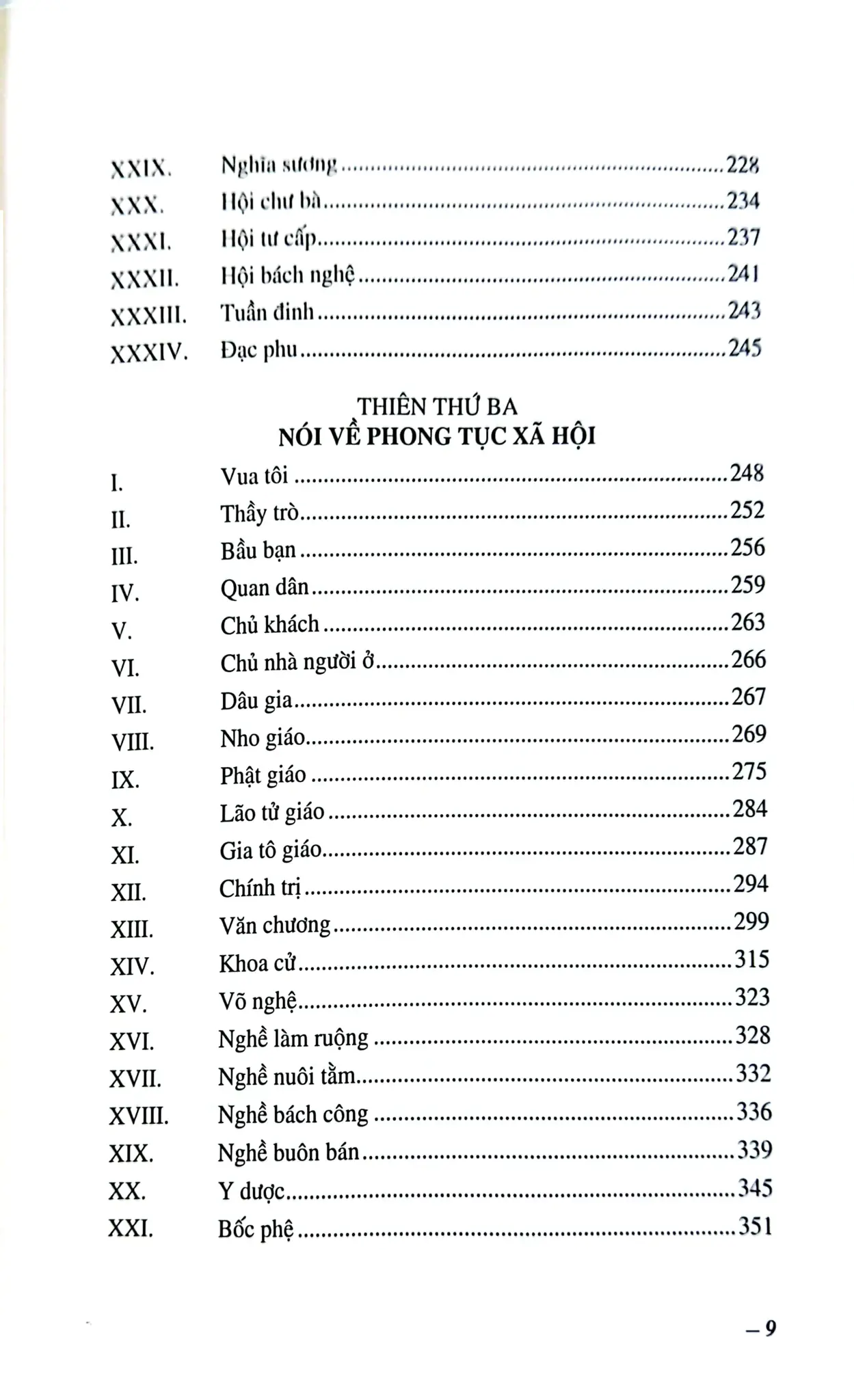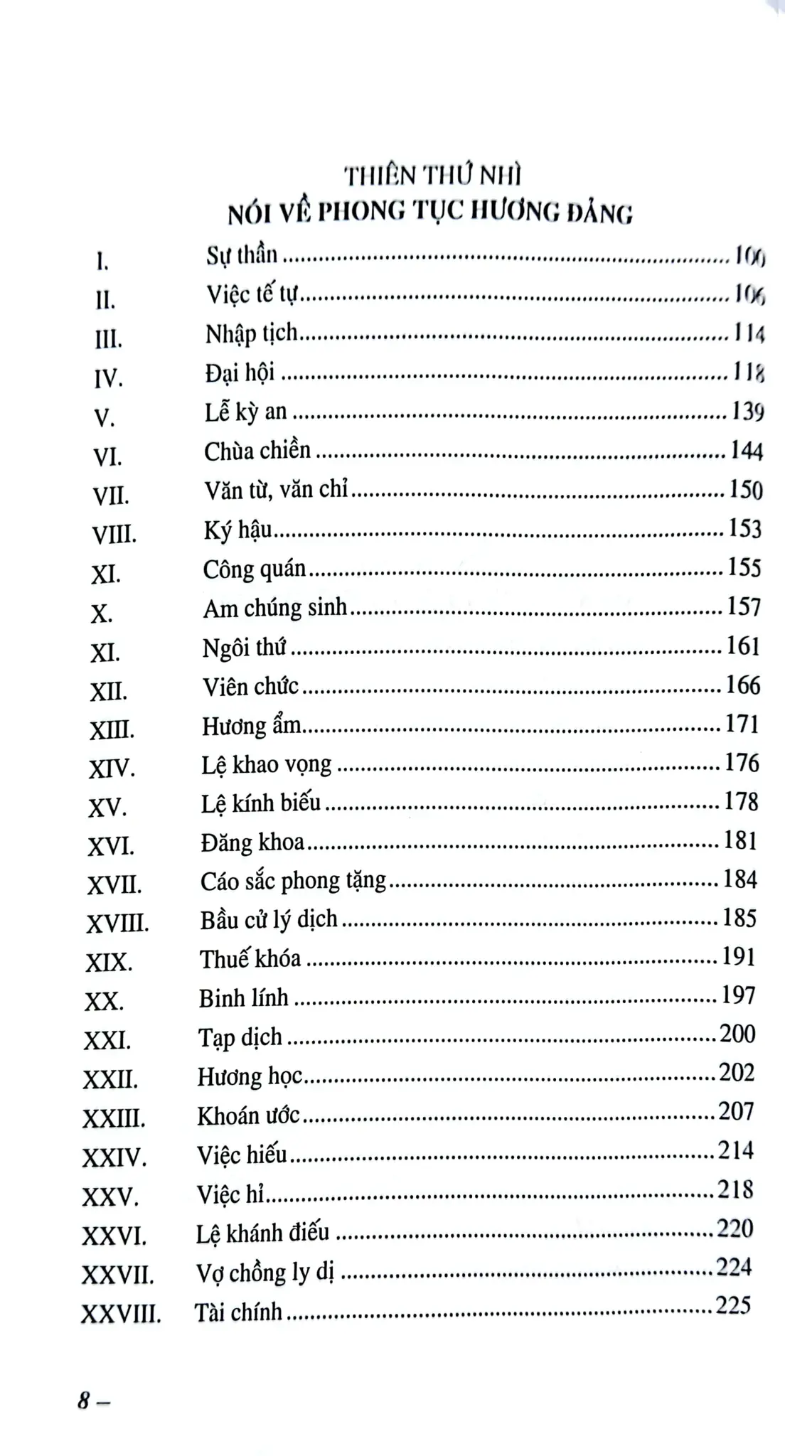 Với 47 mục thuộc 3 thiên, tác giả đã diễn giải tỉ mỉ các phong tục tập quán đã hình thành, trở thành lễ nghi, thói quen, quy ước và điều chỉnh hành vi mỗi người dân trong gia đình, họ hàng làng xóm và đời sống cộng đồng. Từ những chuyện gần gũi thiết thân như ăn mặc, kiêng khem… đến những chuyện tôn giáo, chính trị… Những nếp xưa, thói cũ theo từng trang sách mà hiển hiện mang đến cho người đọc những xúc cảm thật trong lành và dung dị. Những hội hè, lễ Tết, giỗ chạp, ma chay, cưới xin… cũng theo đó mà được tái hiện, phục dựng, như đang bày ra trước mắt người đọc, dẫu khoảng cách về thời gian đã gần một thế kỉ.