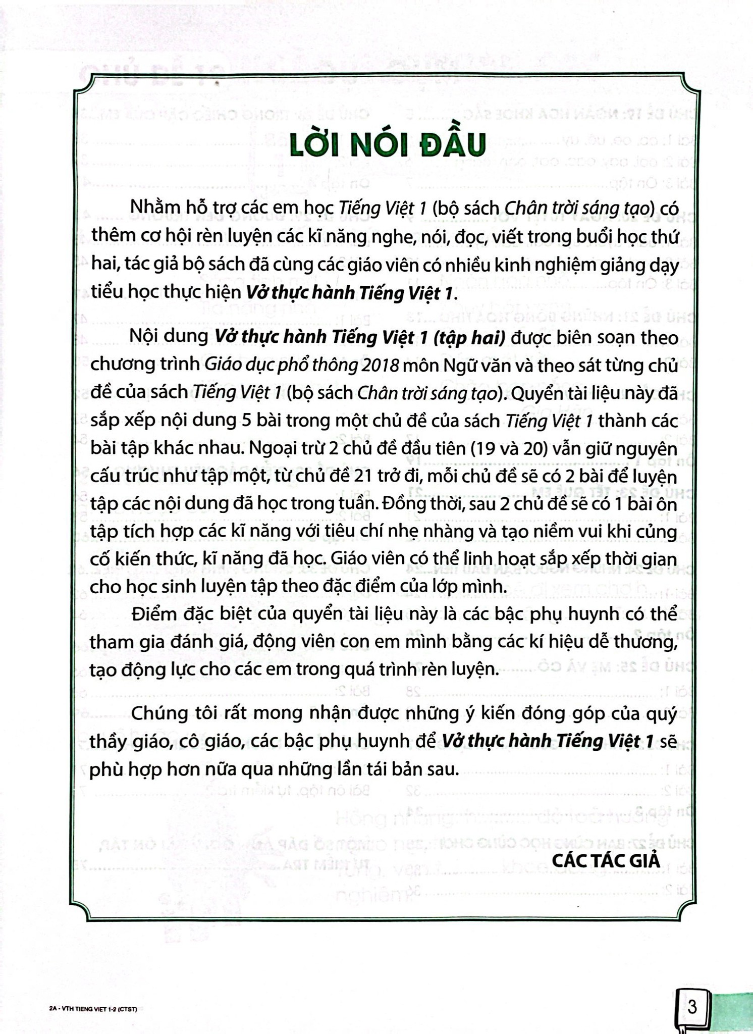 Nhằm hỗ trợ học sinh học sách giáo khoa Tiếng Việt 1, bộ sách Chân trời sáng tạo có thêm cơ hội rèn luyện các kĩ năng đọc, viết, nói và nghe trong buổi học thứ hai, nhóm tác giả – là những chuyên gia, giáo viên có nhiều kinh nghiệm trong lĩnh vực Giáo dục Tiểu học đã thực hiện quyển Vở thực hành Tiếng Việt 1, bộ sách Chân trời sáng tạo.
