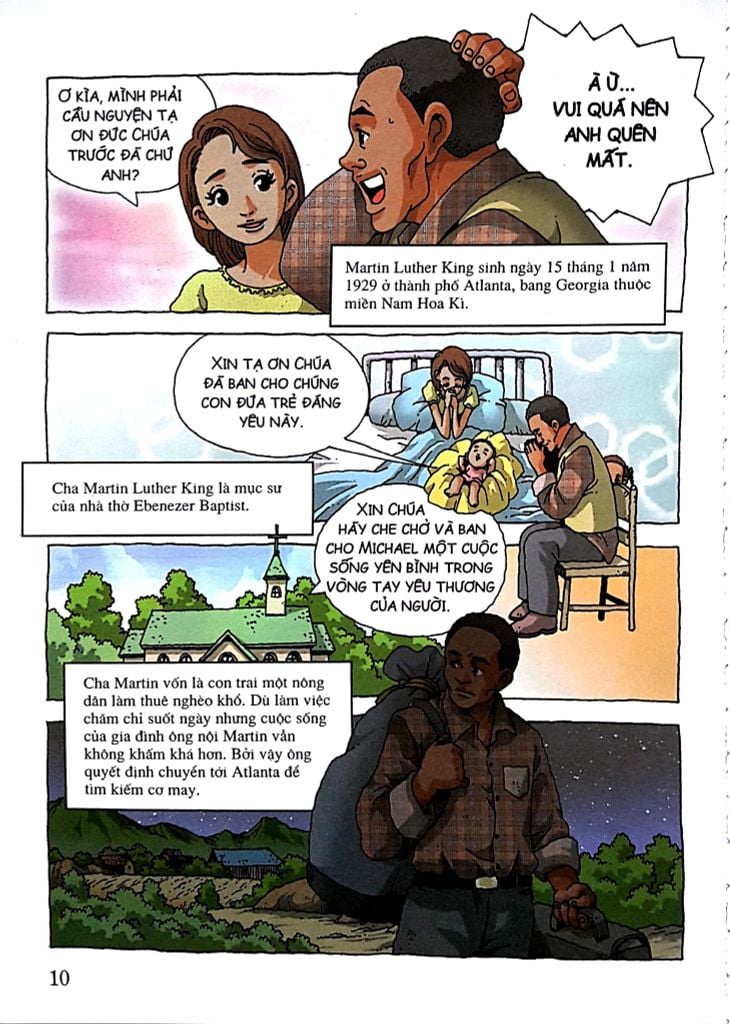 Ngay từ khi sinh ra, giống như đồng bào da màu khác, Martin Luther King luôn phải chịu thiệt thòi vì bị phân biệt đối xử từ người da trắng. Nhưng không vì thế mà ông cam chịu số phận. Bước vào cánh cổng trường học, ông đã đọc sách của các vĩ nhân và tìm con đường đấu tranh đòi công bằng cho người Mĩ gốc Phi. Dù liên tiếp bị các thế lực uy hiếp tính mạng, nhưng Martin Luther King vẫn không chùn bước. Bạn nhỏ hãy đọc và tìm hiểu xem vì sao Martin Luther King đã trở thành nhà lãnh đạo kiệt xuất của phong trào đòi dân quyền và được cocongj đồng người da đen trên toàn thế giới ngưỡng mộ nhé!