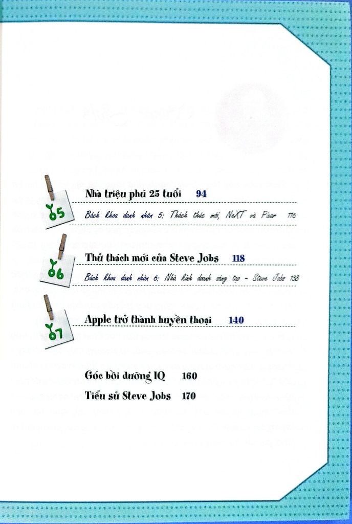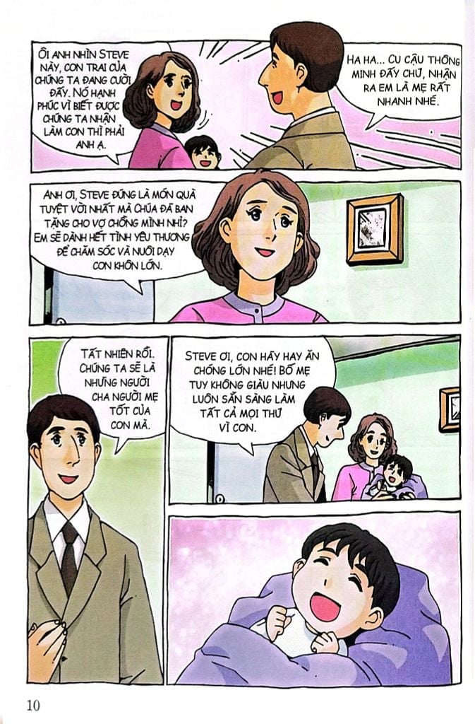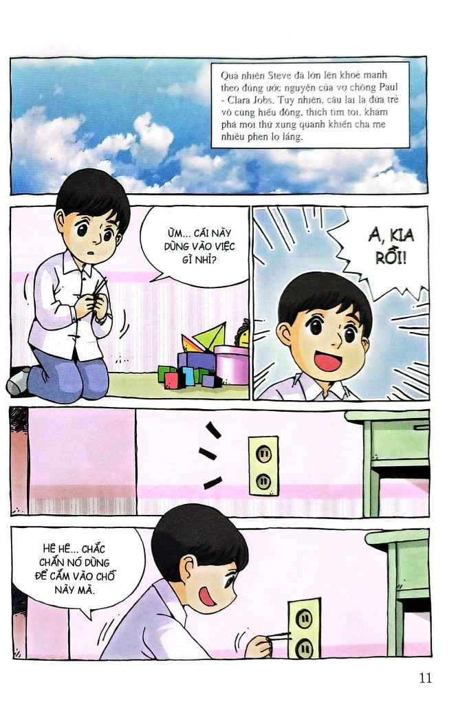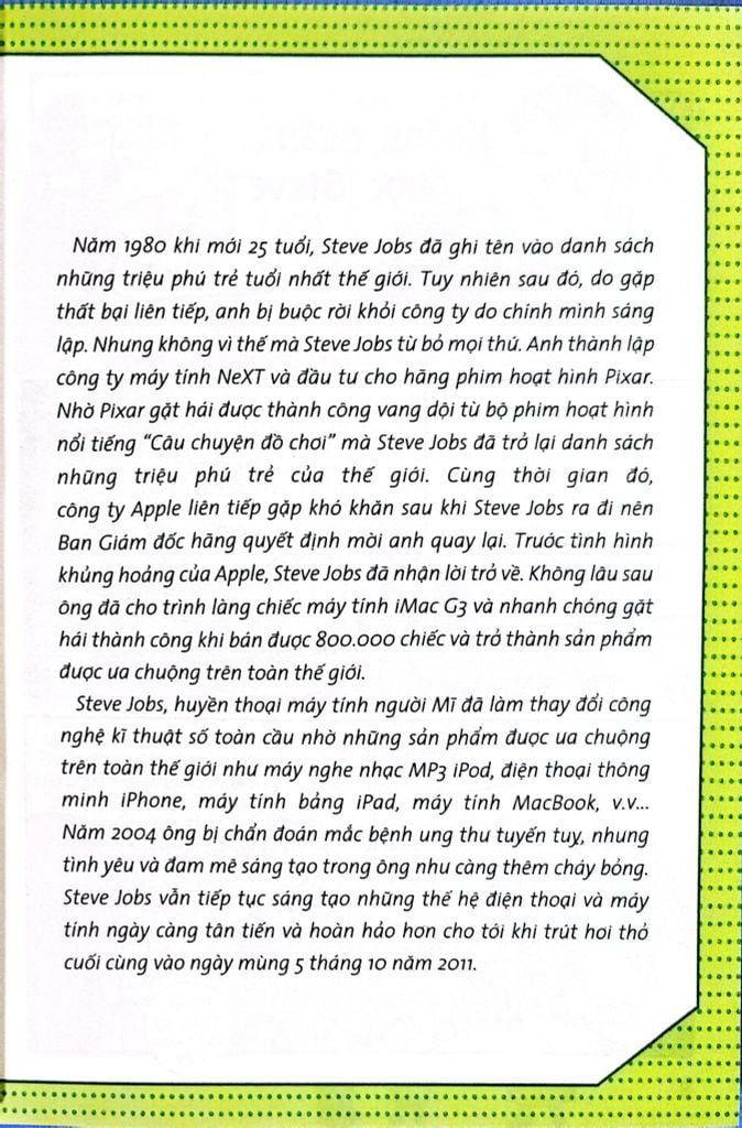 Đó là những mốc quan trọng trong cuộc đời của Steve Jobs, người được ca ngợi là biểu tượng của thời đại kĩ thuật số nhờ có bộ óc thiên tài và khả năng sáng tạo tuyệt vời. Hi vọng các bạn nhỏ lớn lên cũng có niềm đam mê sáng tạo và cống hiến hết mình như “phù thủy công nghệ” Steve Jobs.