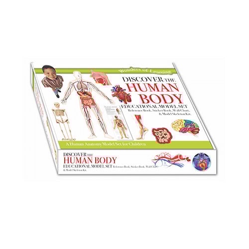 Wonders of Learning discover the human body educational model set. This guide to human anatomy for children includes a reference book, sticker book, wall chart and model skeleton kit. Fun and informative for young biology fans.