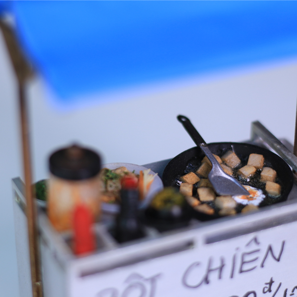Mô hình tập trung vào việc mô phỏng lại một cách sinh động xe bán bột chiên, một món ăn vặt được nhiều thế hệ yêu thích. Các chi tiết được thiết kế để trông mộc mạc và chân thực nhất có thể: